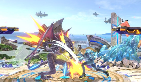 ゼロスーツサムスとの近距離戦では発生が非常に速い弱攻撃、リーチが長い上スマッシュや横スマッシュ、